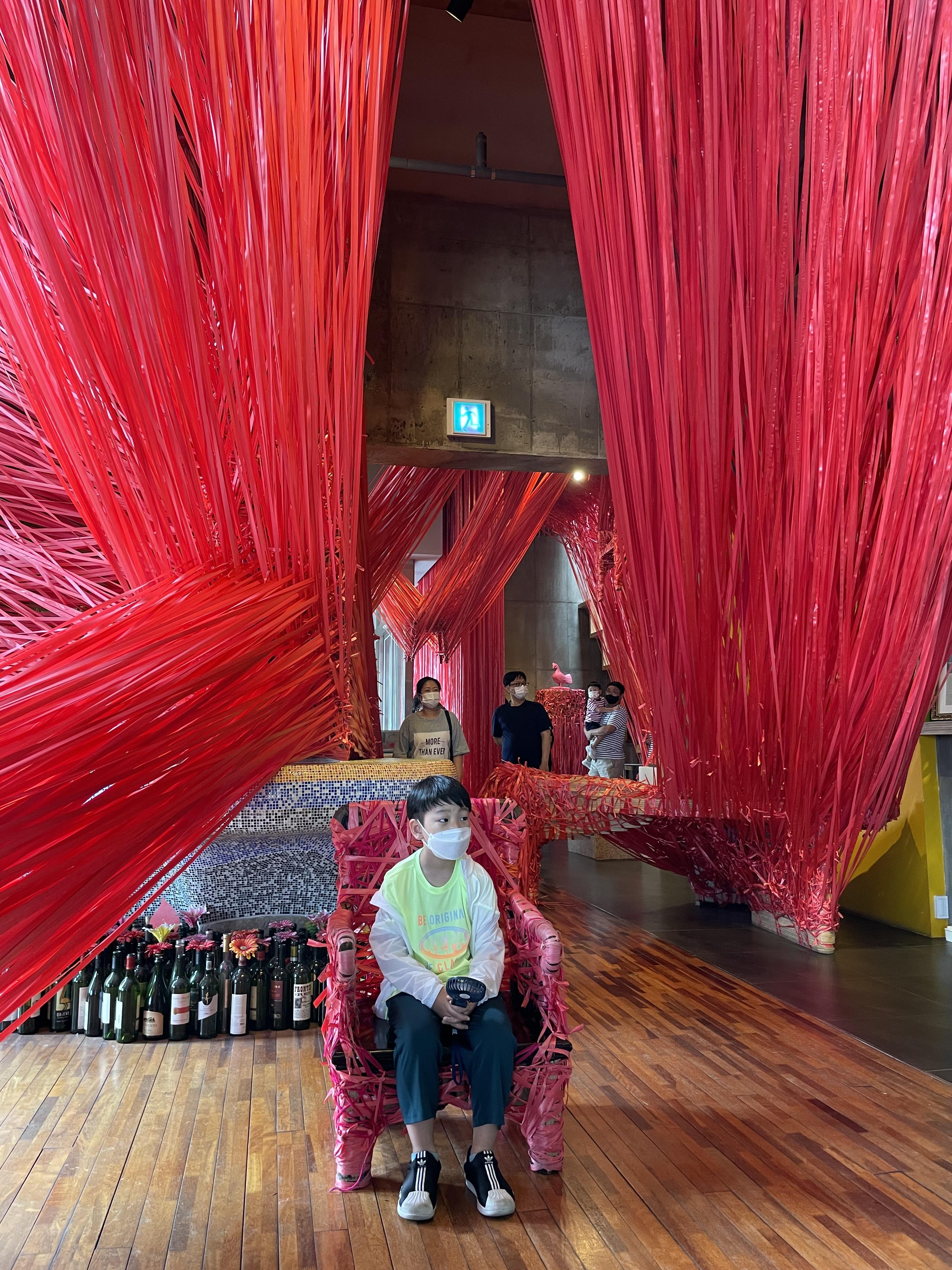 빨간 나일론 끈으로 꾸며진 공간이 보인다.